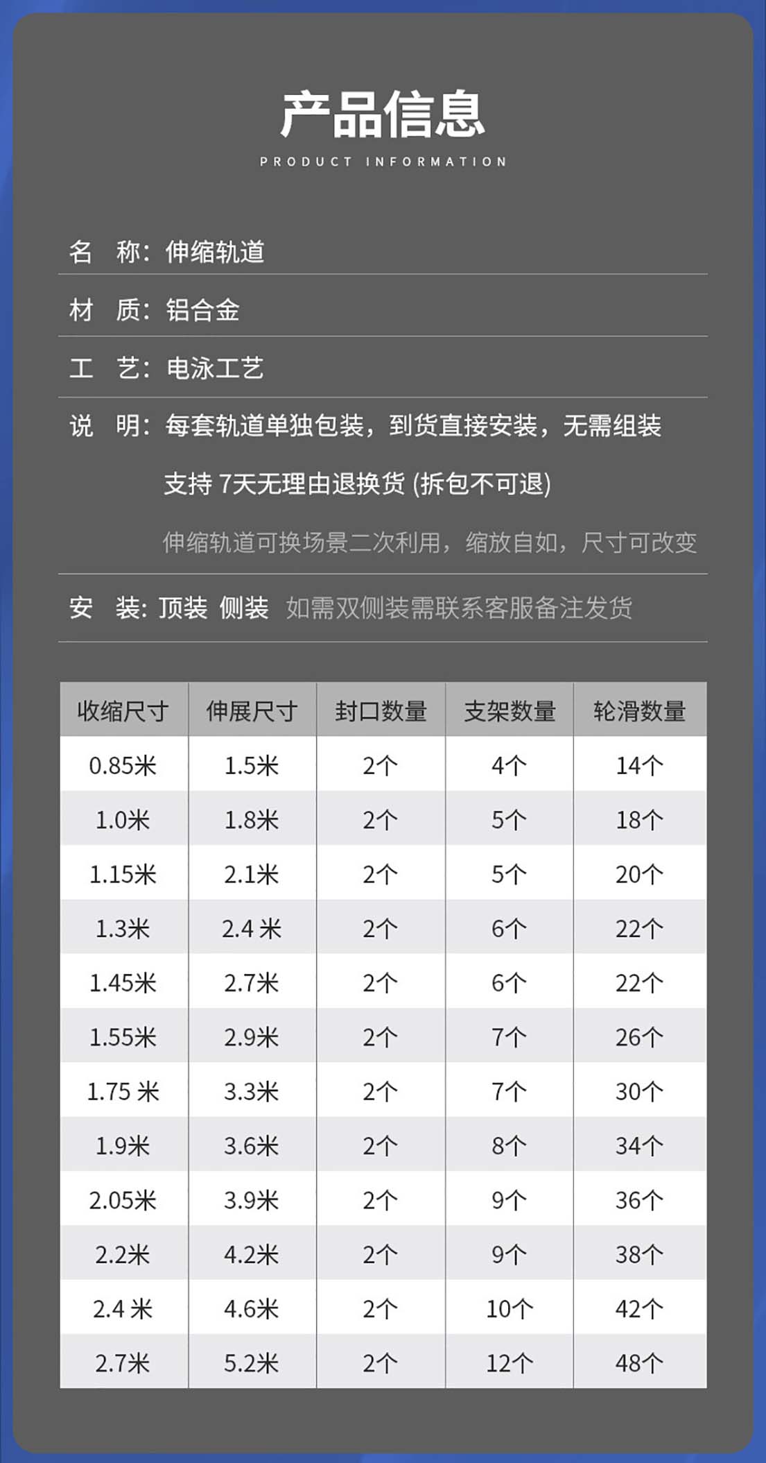 双轨顶装:【2.7米-5.2米】(可伸缩)