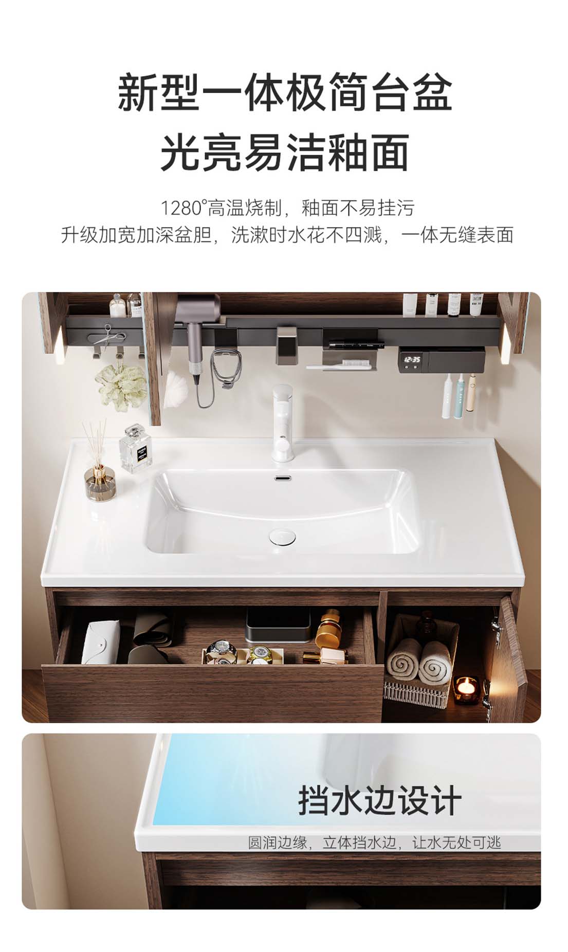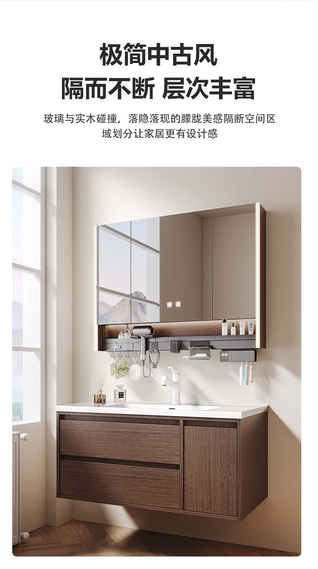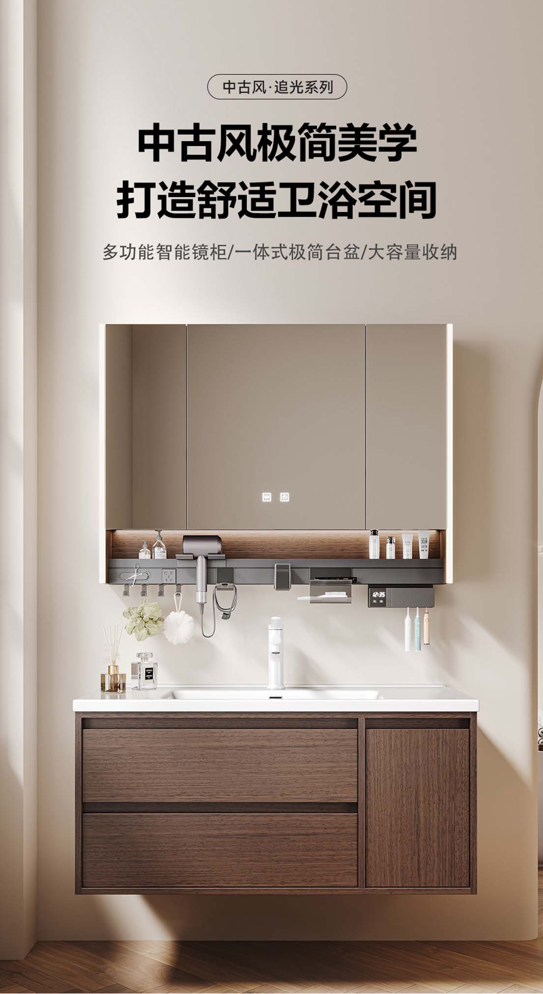 中古风实木浴室柜 陶瓷一体盆卫生间洗漱台柜智能镜卫浴套装