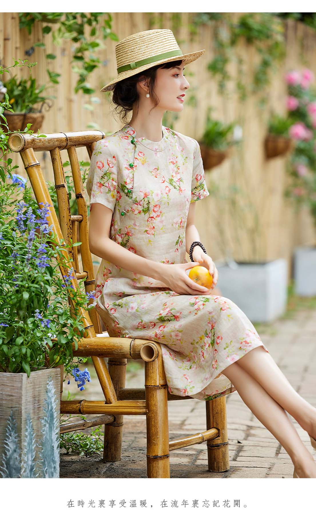 ¥393.60苎麻改良旗袍裙 文艺复古印花连衣裙