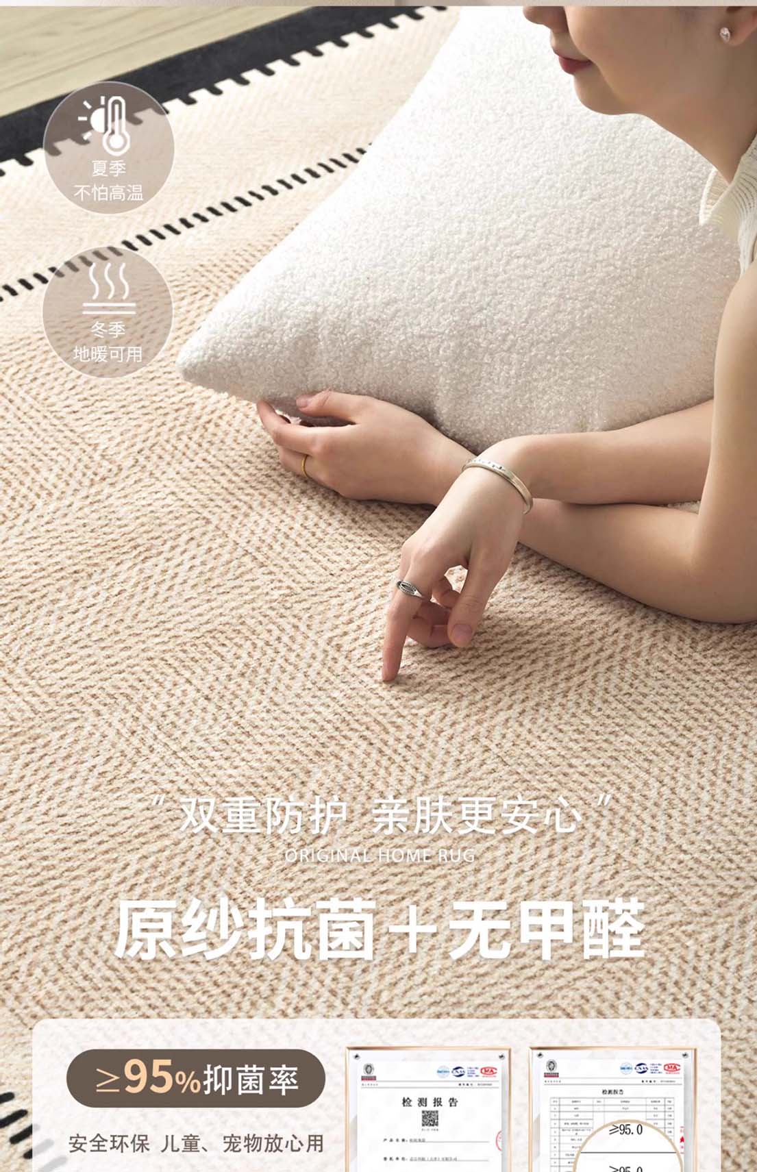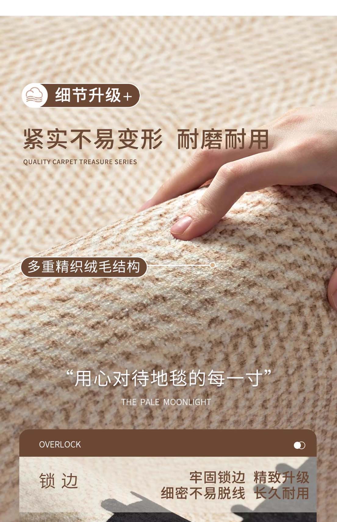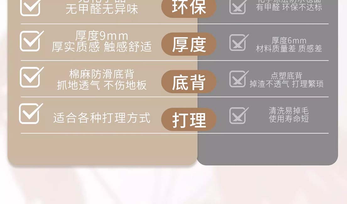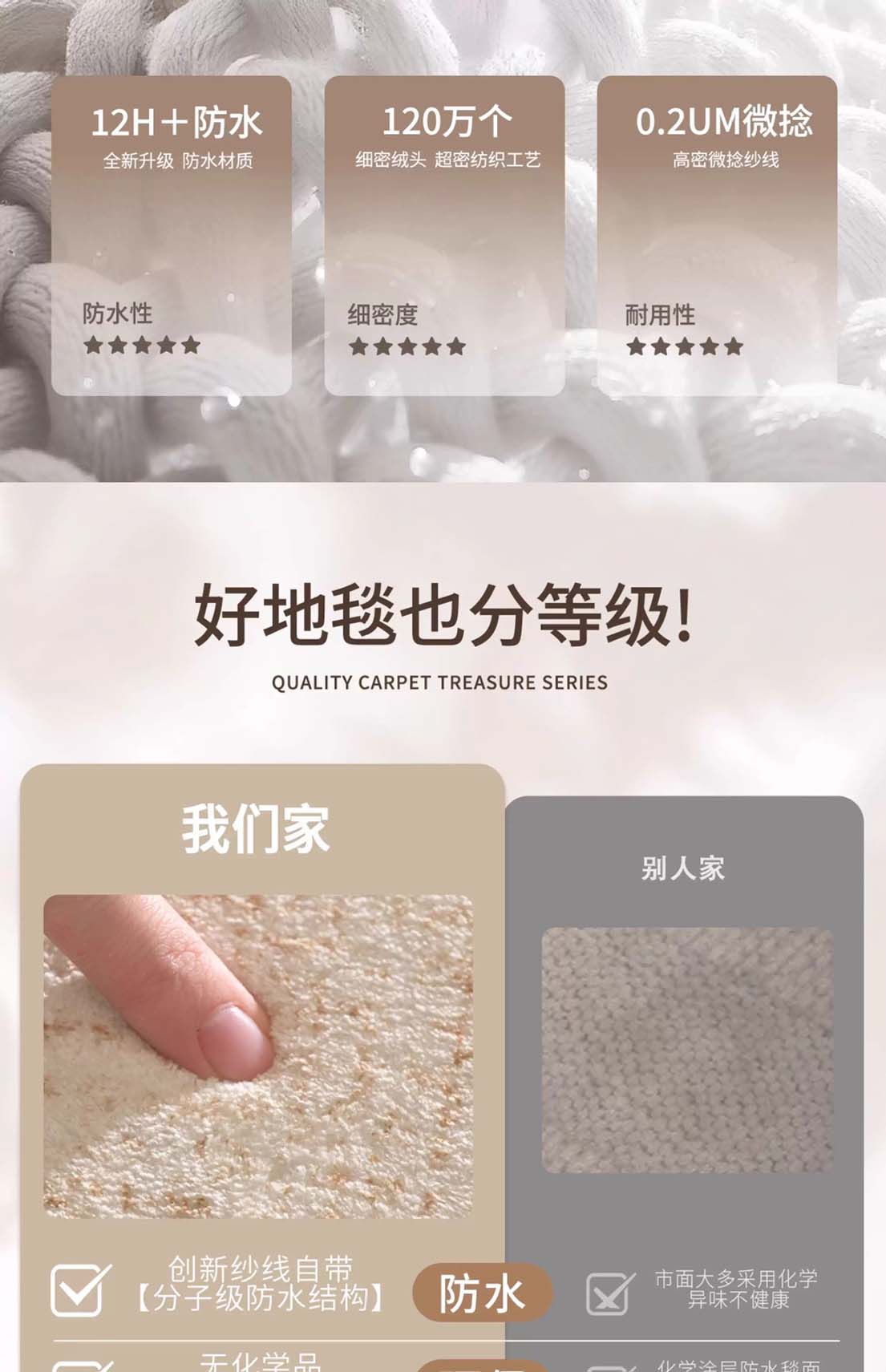 ★拒绝掉毛 拒绝起球★毯面升级荷叶凝水效果★毯面细腻亲肤★双线包边 美观耐磨★防水防潮 品质保证★环保棉麻底背★升级加厚 柔软舒适★高密度毯面不易藏灰★光脚可踩 安全环保