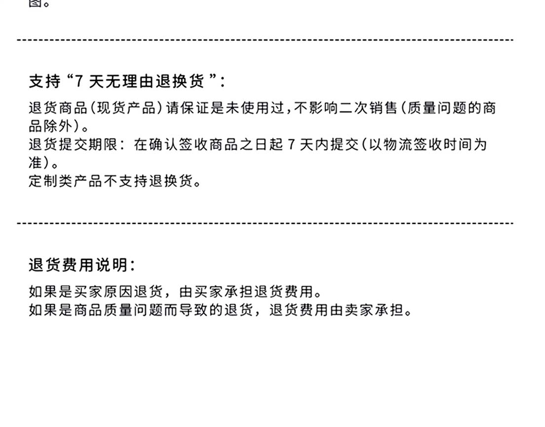 您可以在签收货物后七(7)天内,在非因质量问题,且无人为损坏,不影响二次销售的情形下免费更换与所需更换商品除尺码和颜色外其他属性一致的等值新品。