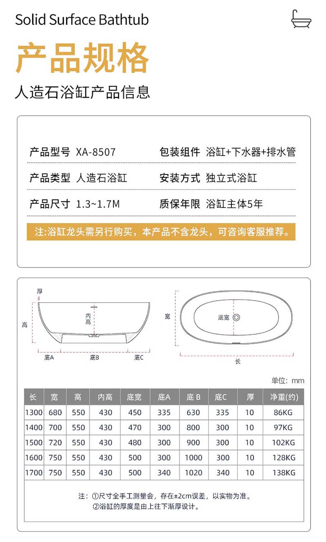 ¥4437.60独立式人造石浴缸 家用轻奢酒店民宿椭圆形浴缸