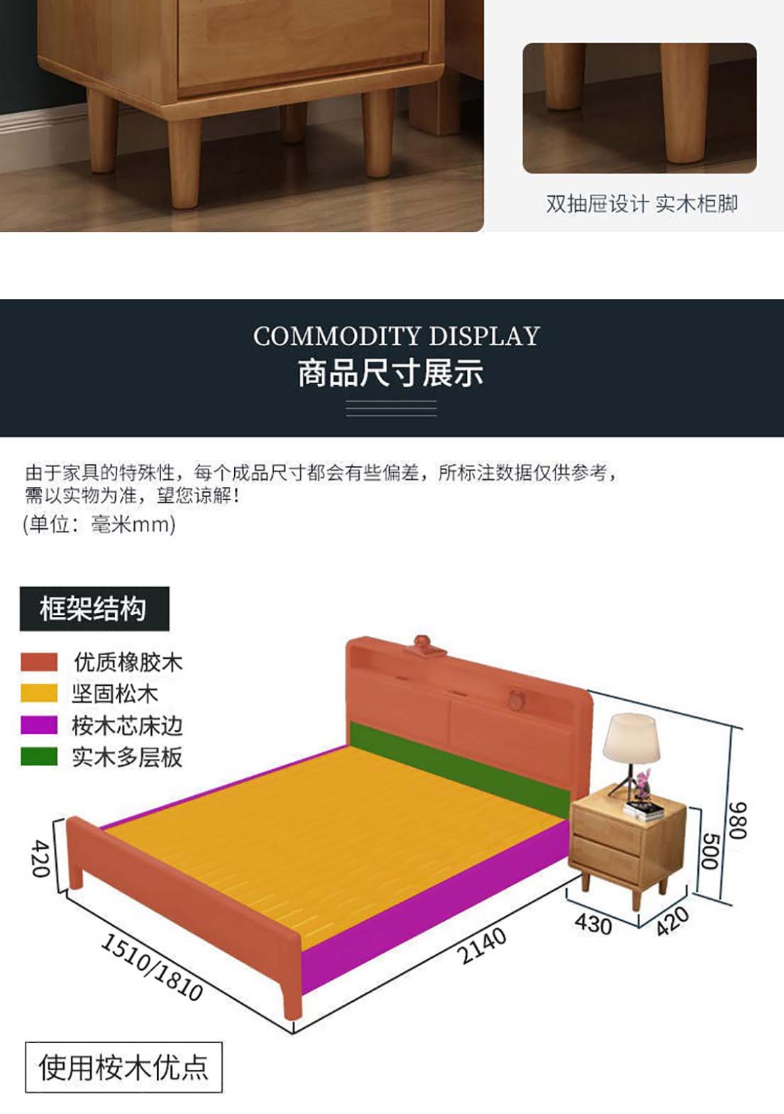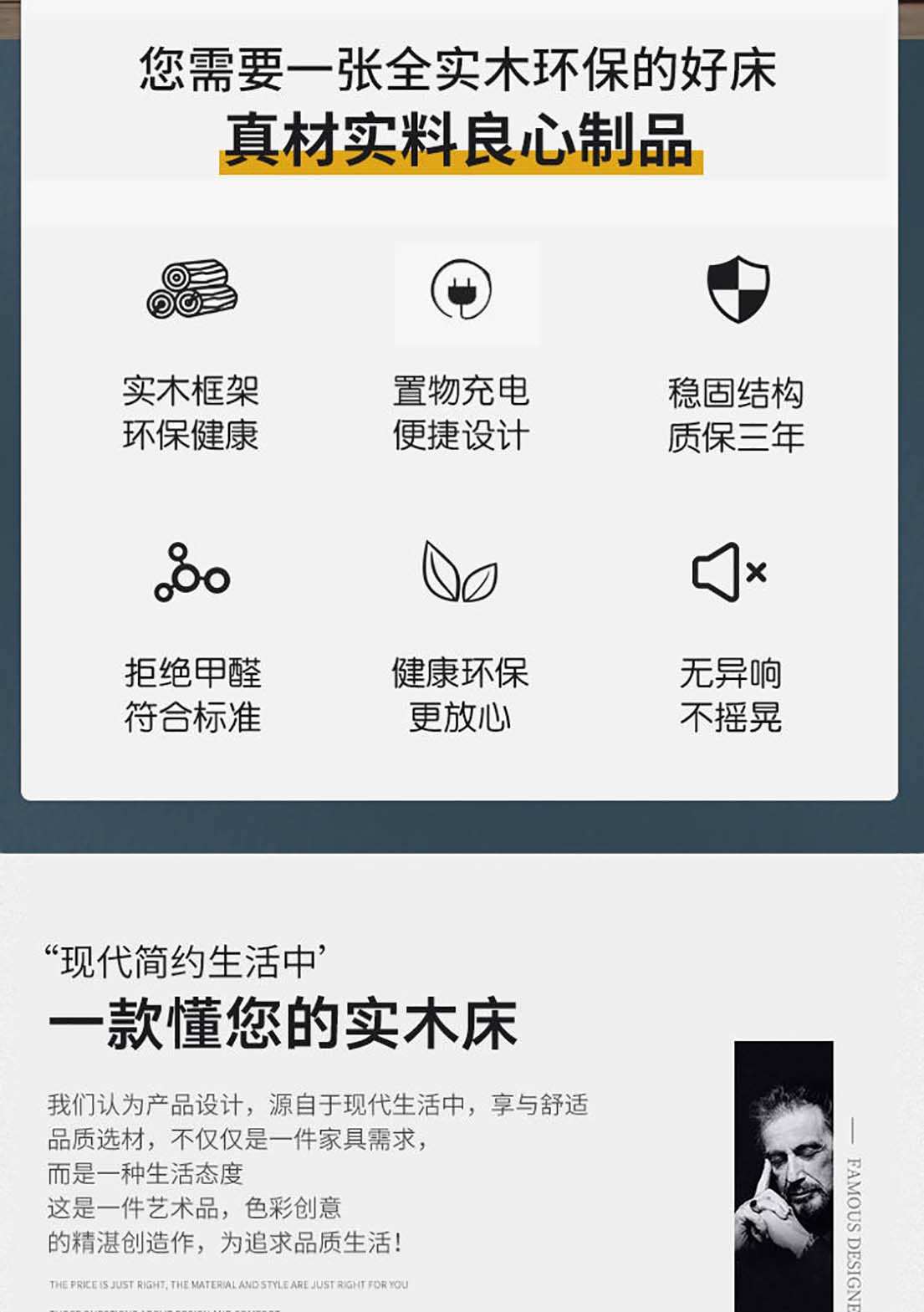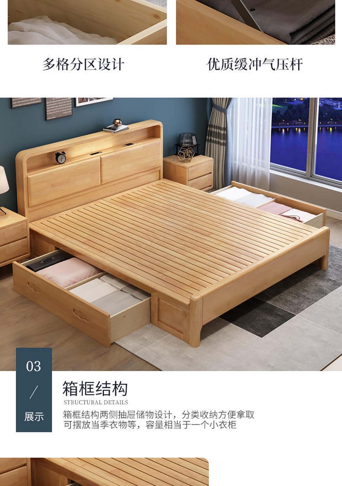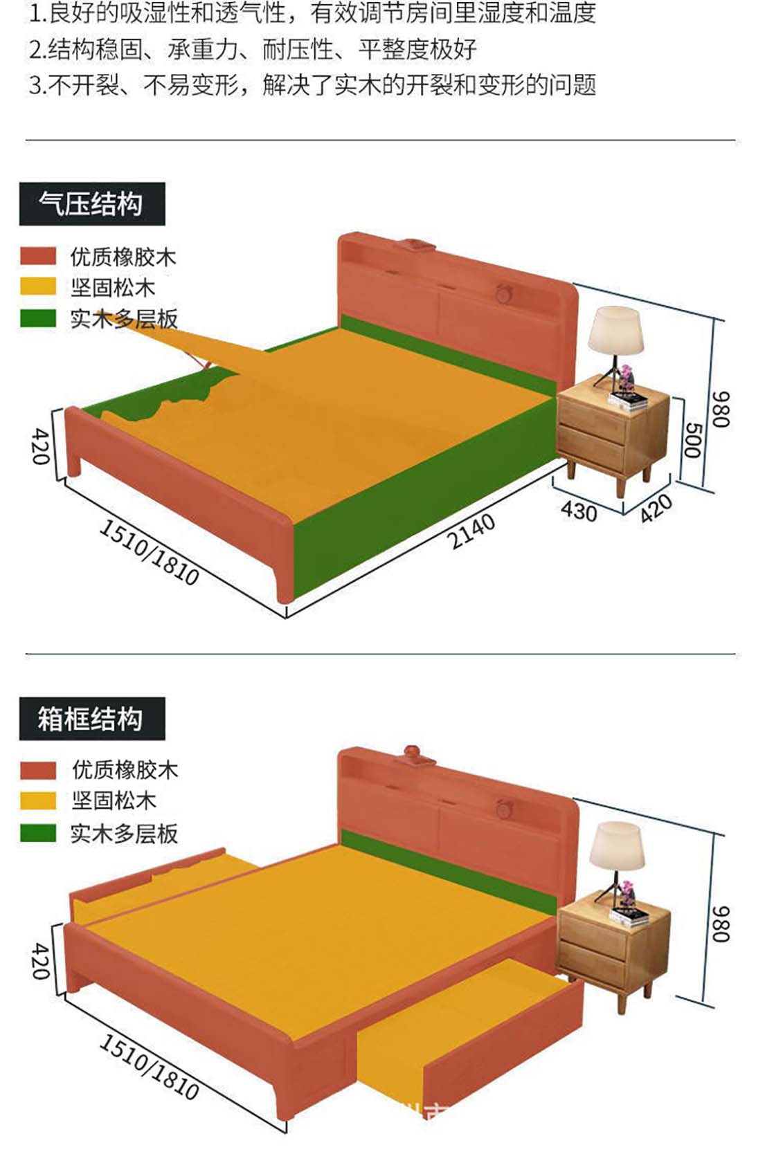 北欧实木床带夜灯现代简约双人床软包床青少年儿童床