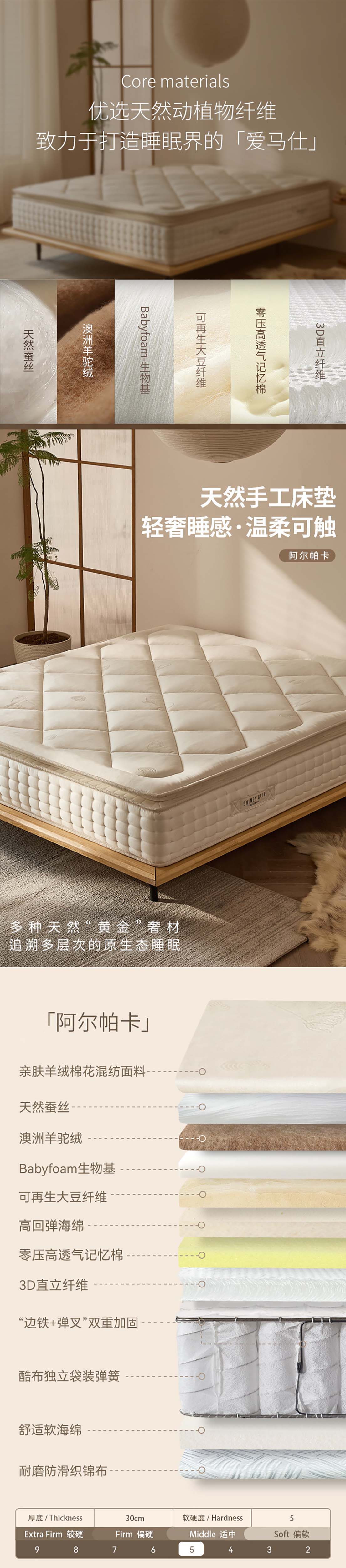 轻奢系列手工床垫 家用天然蚕丝大豆纤维独立袋装弹簧床垫定制