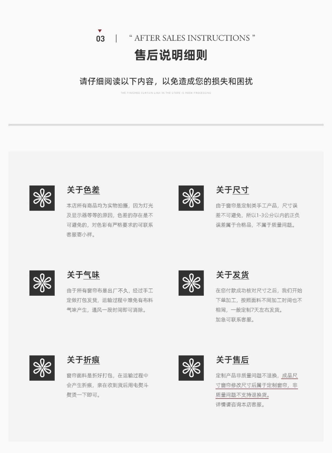 下单时请备注每幅窗帘的尺寸;窗帘布定高2.8米、可改高度;按布宽计价、价格含加工费, 建议按1米轨道2米宽布的比例定制;默认韩褶S钩加工、可改打孔;拿样、测量、安装请联系客服